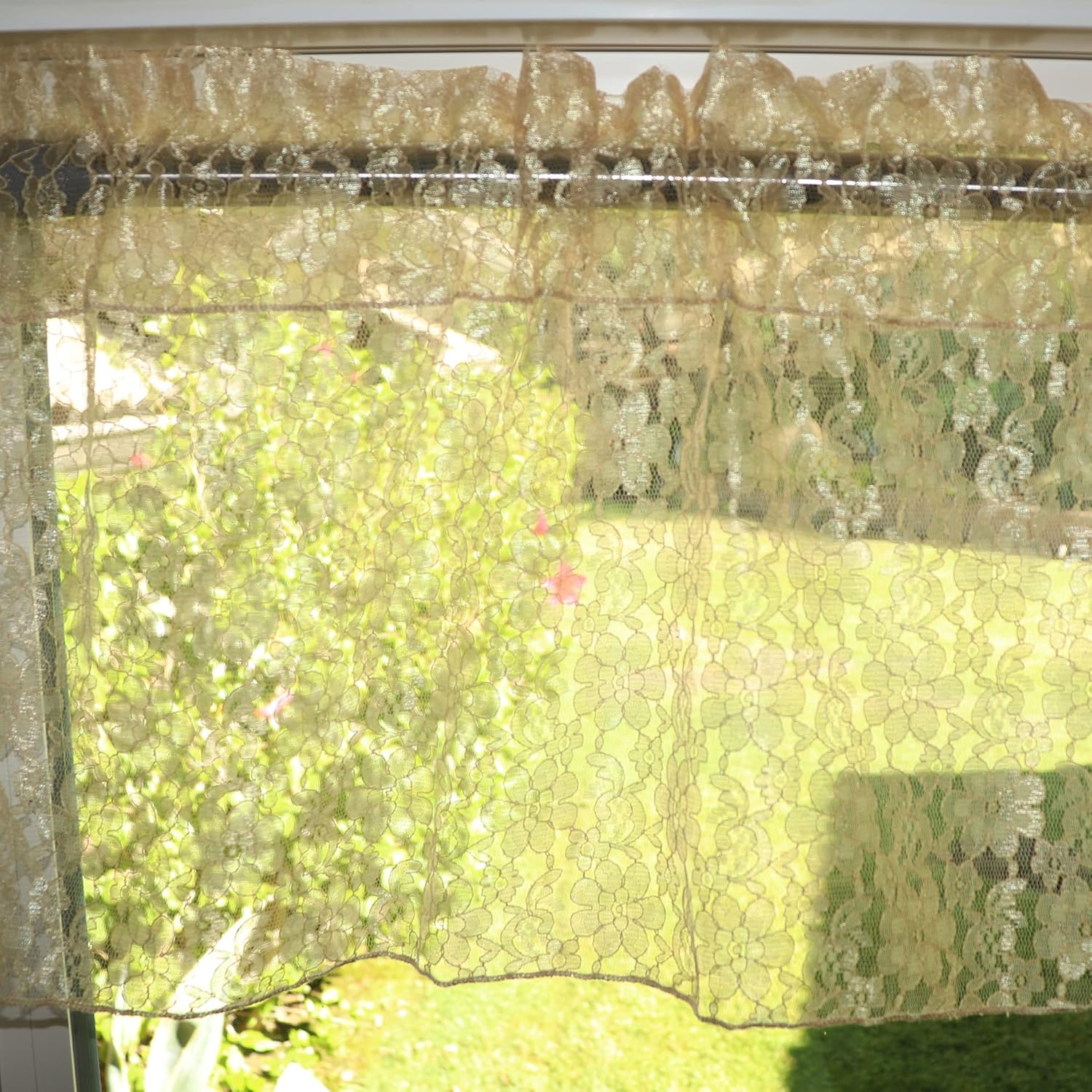 Sheer floral lace window valance treatment. Multiple Sizes and Colors Available. Easy Care Machine Washable. Made in America.